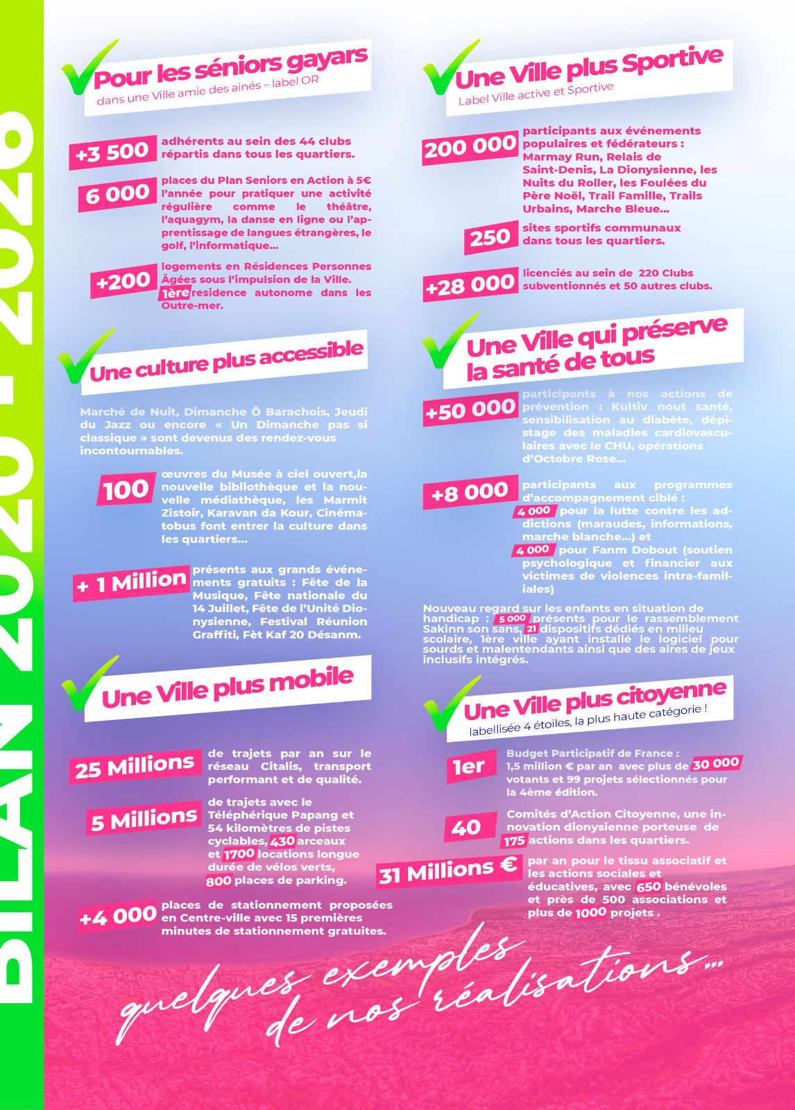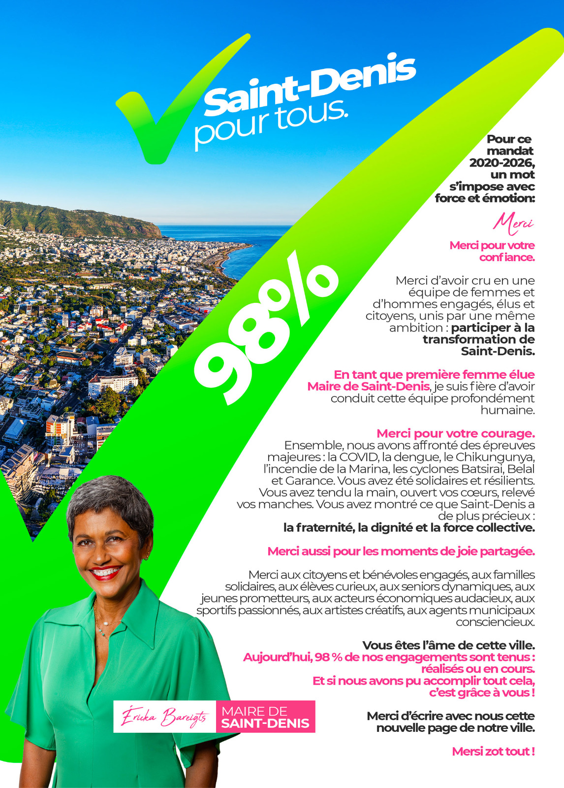 98% de nos engagements sont tenus ! « Ensemble, nous poursuivons la transformation de Saint-Denis, une ville plus proche, solidaire et innovante, construite avec et pour tous ».